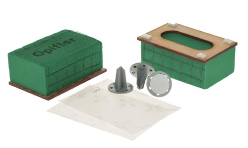 6,5 cm magas nedves oázis, stabil fatalapzaton, 4 db lakkvédő szivacspárnával. Speciális Opiflor lakkvédő fólia + 2 öntapadós Sweetyfix rögzítő (a biztonságos rögzítésért).