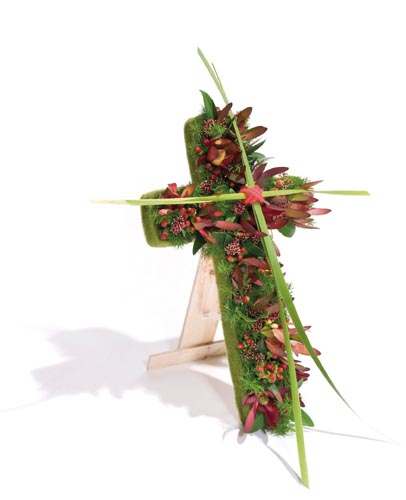 Drótkabátos kereszt, keskeny felülete ellenére is biztosan rögzíthetők a virágok. Stabil fatalapzat.