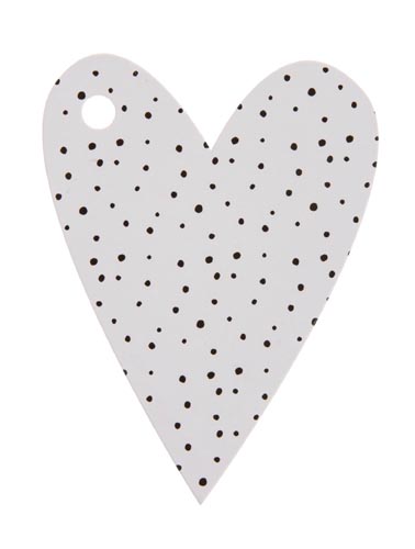 Ajándékcímke szívek, fehér, fekete pöttyös, 52x70mm, 20 db