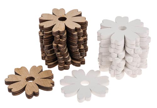 Fából készült szóródarabok virágok formájában. 2 színben: fehér és natúr. 20 darab egy zacskóban.