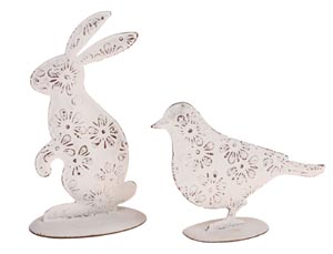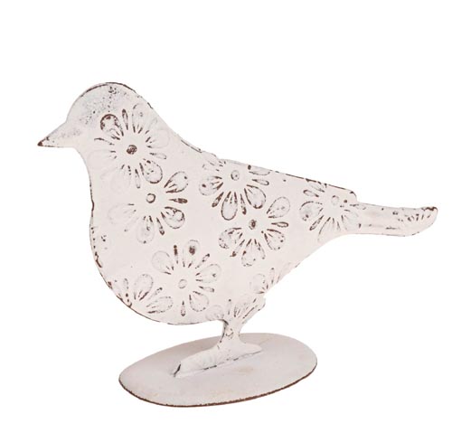 Fém madár virágokkal, szürke - fehérre meszelt, 12, 5x4, 5x9, 5 cm