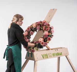 Egy optimális segédeszköz koporsó csokrok és díszek kötéséhez. Különböző méretű koszorúkhoz alkalmas, 2 fokozatra dönthető. A koszorúka rögzítése egy külön stabilizátorral történik. Összecsukott állapotban az elkészült csokrok szállítására kíválóan alkalmas. Max méret 2 m.