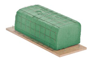 Tisztafa alapra helyezett oázis. Az alaplap kinyúlik, így könnyebben lehet vele dolgozni. 4 db előre montírozott rögzítési lehetőség, 2 db előre fúrt csavarlyuk. Az össz hossza 6 cm hosszabb mint a hozzá illő oázis hossza.