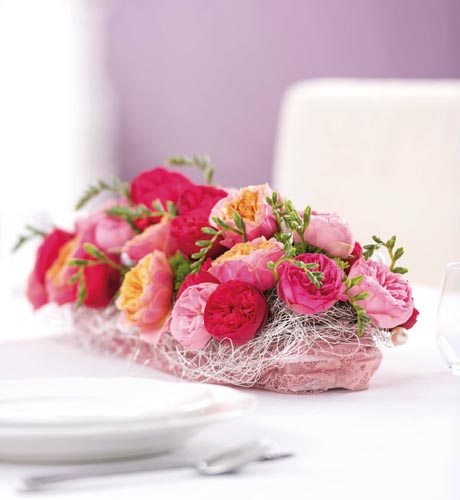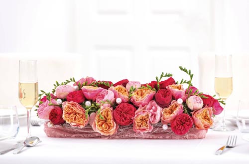 Vágott asztali virágdísznek, vízhatlan fehér műanyag alátétben, praktikus öntő peremmel.