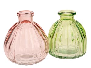 Kicsi, barázdált váza színes üvegből, ø nyilás rózsaszín: 2 cm. zöld: 2,5 cm