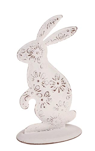 Fémből készült dekoratív nyuszi fehér virág motívummal.